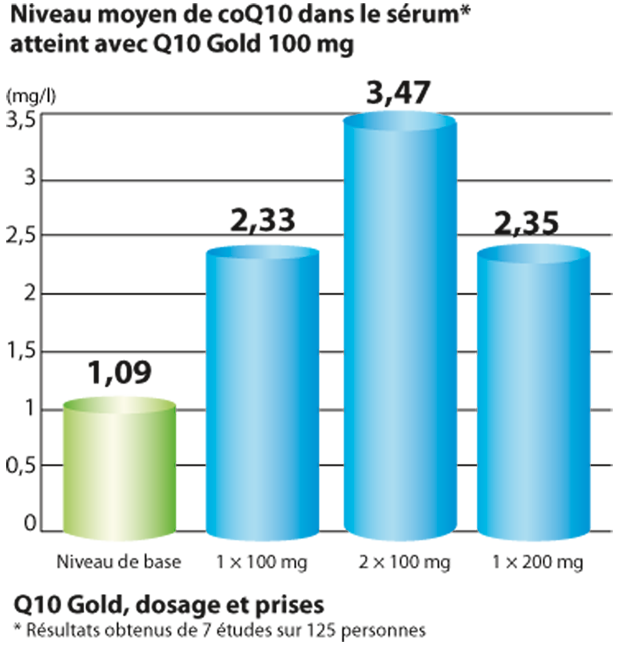 Les patients de l'étude Q-symbio qui ont bénéficié du traitement actif recevaient Myoqinone (Q10 Gold 100 mg), à raison de 100 mg 3 fois par jour. Bien que cela eût été plus facile, les participants ne recevaient pas 300 mg en une fois, et ce pour une bonne raison. En effet, si vous prenez plus d'une capsule par jour, l'absorption sera supérieure si vous répartissez les prises sur la journée (par ex., 1 capsule au petit déjeuner, 1 capsule au déjeuner et 1 capsule au dîner) plutôt que de prendre la dose quotidienne en une seule prise.