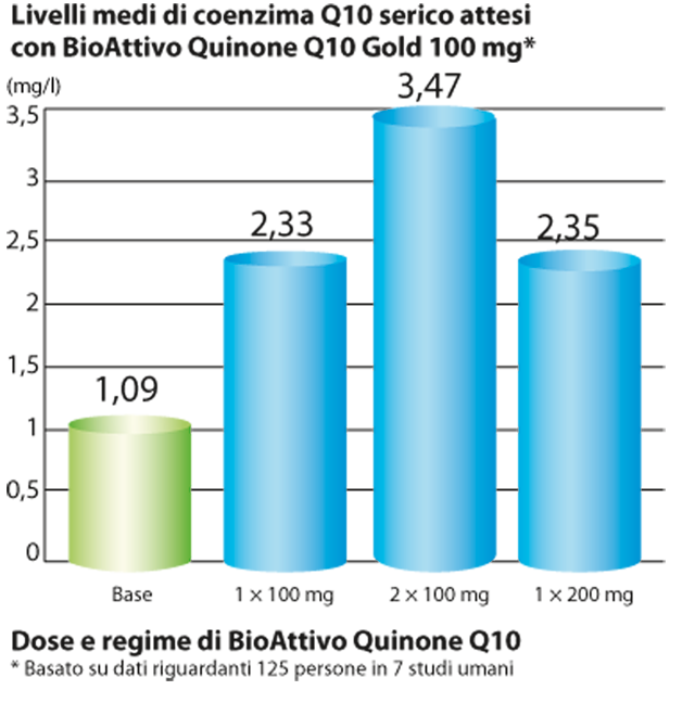 Ai pazienti dello studio Q-Symbio che hanno ricevuto la cura attiva è stato somministrato il Myoqinone (Q10 Gold), 100 mg 3 volte al giorno. C'è un motivo per cui ai partecipanti non sono stati somministrati 300 mg una volta al giorno, sebbene sarebbe stato più semplice. La motivazione è che, se si assume più di 1 capsula al giorno, l'assorbimento sarà più elevato distribuendo la dose nel corso della giornata - ad esempio 1 capsula a colazione, 1 capsula a pranzo ed 1 capsula a cena - piuttosto che assumere l'intera dose giornaliera in un'unica volta.